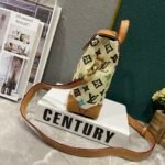 The handbag is from the brand’s collaboration series with Tyler. It presents a pocket-sized version of the Steamer handbag in Monogram Craggy canvas. The artist gives the Monogram pattern a hand-painted look. Cowhide leather shapes and reinforces the corner guards. shoulder strap. and flap.