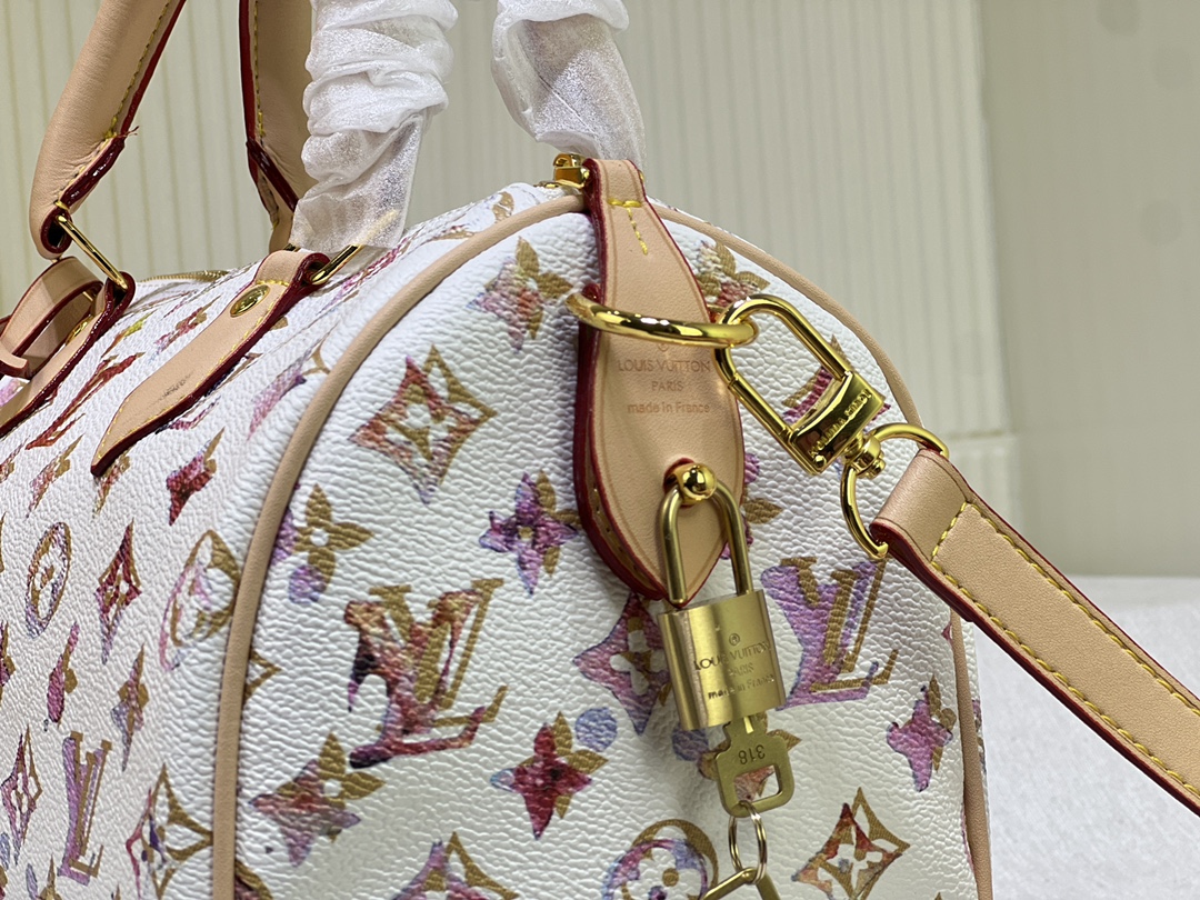 This Speedy P9 Bandoulière 25 Monogram Leather handbag is made of soft cowhide leather and reproduces the refined look of canvas printing with the Monogram pattern. Dazzling metal parts. sheepskin leather lining and nameplate together confirm the creative director Pharrell Williams’ unremitting pursuit of details. Size: 25x15x15cm.