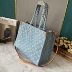 Blue Denim Checkerboard. Denim Quad Collection Onthego This Onthego handbag is refreshed with sand-washed Monogram jacquard tannins. with leather trimming and contrasting stitches. For business or leisure needs. the exquisite handle and long shoulder strap unlock a variety of carrying methods. Dimensions 35.0 x 27.0 x 14.0 cm